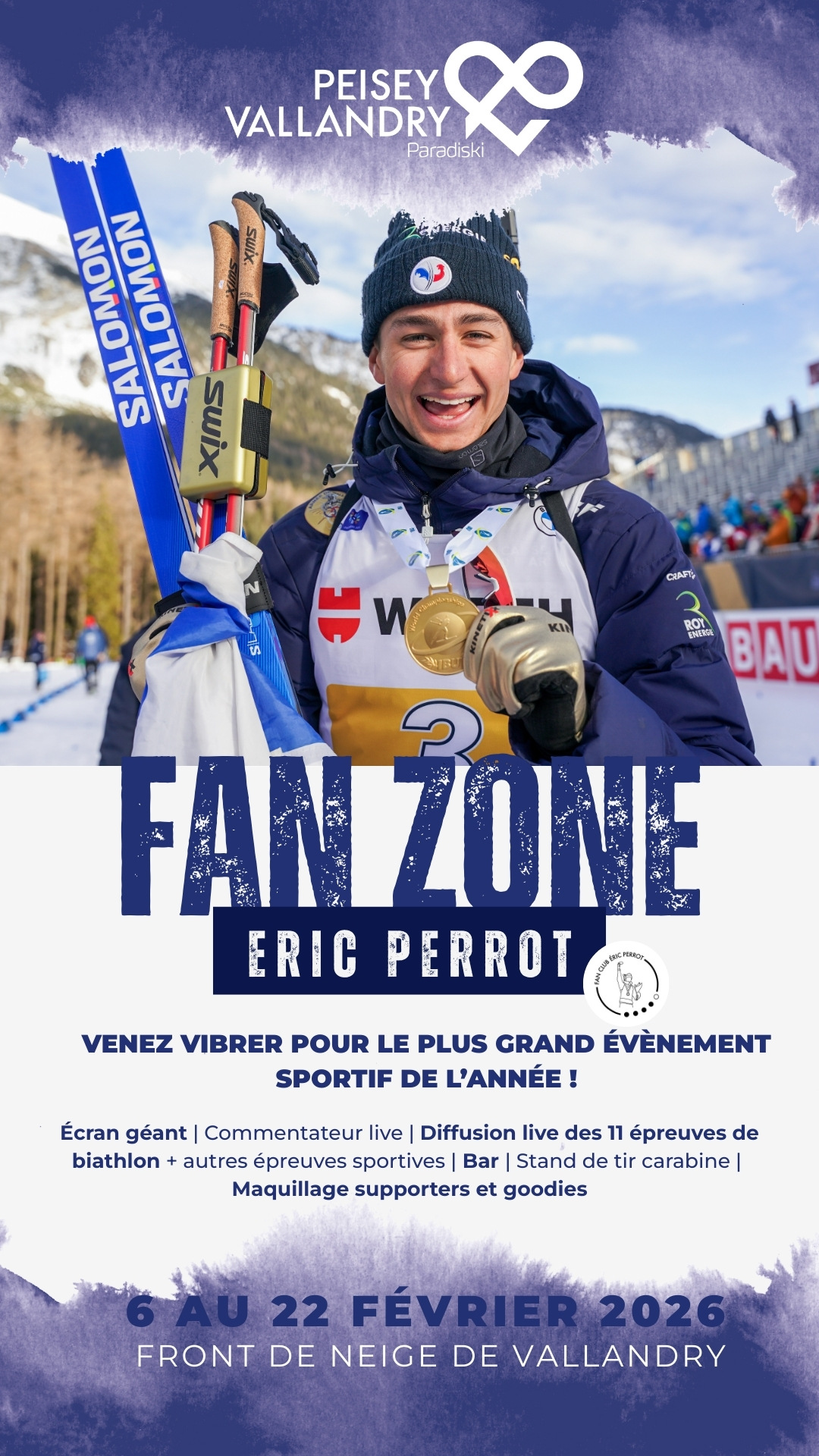Vom 6. bis 22. Februar verwandelt sich der Schneepark von Vallandry in eine festliche und gesellige Fan Zone, die den Fans von Éric Perrot (und zukünftigen Fans!) sowie allen Biathlon- und Wintersportbegeisterten gewidmet ist!